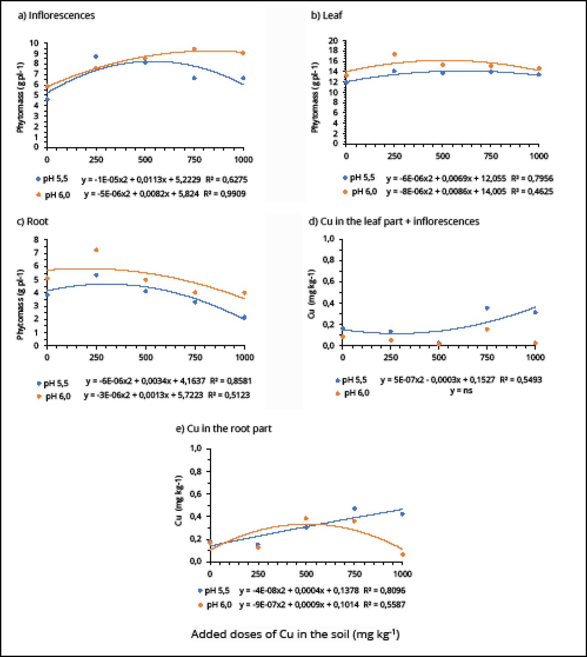 It was verified that the phytomass of the inflorescences was higher in the added content of 250 mg kg-1 of Cu at pH 5.5 and in the contents of 750 and 1,000 kg-1 of Cu at pH 6.0. In relation to the leaf phytomass, they remained approximate, however, root phytomass showed a decrease according to the increase of Cu contents in the soil for both soil pH corrections.