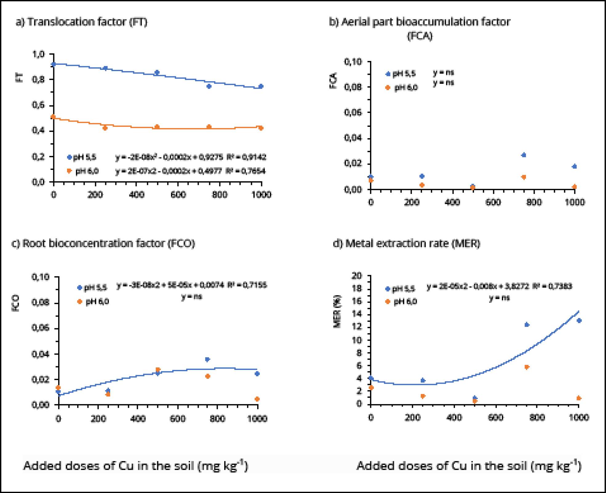 The shoot bioaccumulation factors (FCA) were not significant between the soil pH and the Cu contents, and for the root bioconcentration factors (FCC), Figure 5c, it was observed that there was a low correlation of the data for the pH 5.5 and a non-significant relationship for pH 6.0, indicating that marigold plants are tolerant to the cultivation in soils containing excess Cu.