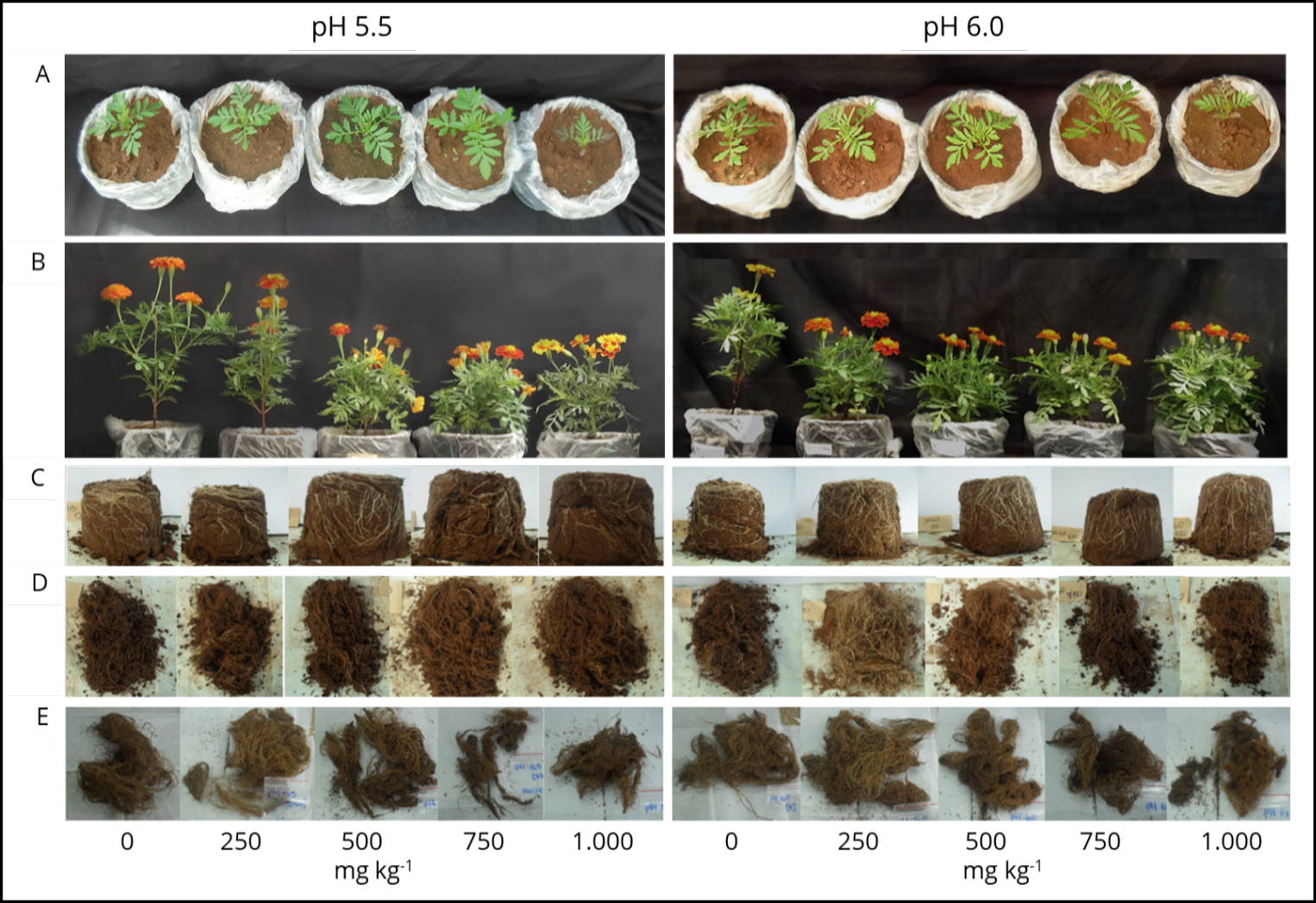It was found that the vegetative and floristic development of marigold plants was satisfactory in all treatments containing different Cu contents and soil pH, without typical changes in plant plasticity (Figures 2; 3 and 4). Menegaes et al. (2019) verified the same conditions of vegetative and floristic development for wild carnation plants grown in Cu-contaminated soils.
