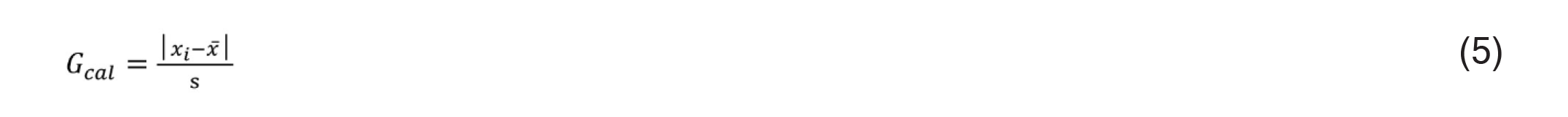 onde xi representa o valor suspeito, representa a média, s representa o desvio padrão e Gcal representa o valor calculado de Grubbs. (Harris, 2013; Mendham, 2015).