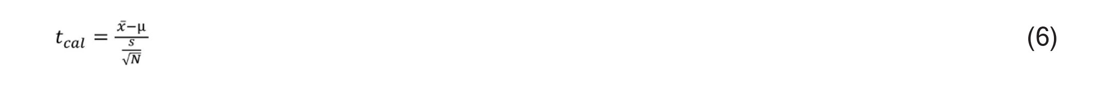 onde tcal representa o valor calculado de t, representa a média, s representa o desvio padrão, N representa o número de repetições do grupo e μ representa o valor médio de massa de cada brigadeiro considerando a possibilidade da confecção de 30 brigadeiros para um pote de 400g.