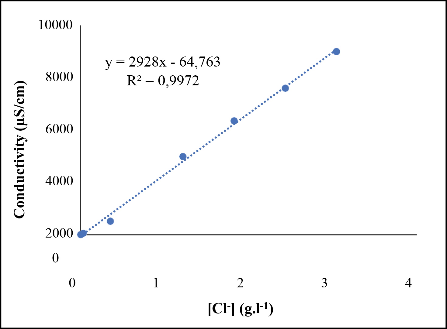 The determination of electrical conductivity was carried out using a microprocessed conductivity meter from the Quimis brand calibrated with a standard solution of potassium chloride (KCl) 0.01 Mol.L-1, which corresponds to 1408.3 mS/cm at 25 ºC. the standard curve of conductivity as a function of the variation in the concentration of chloride ions used in this study can be seen in Figure 4.