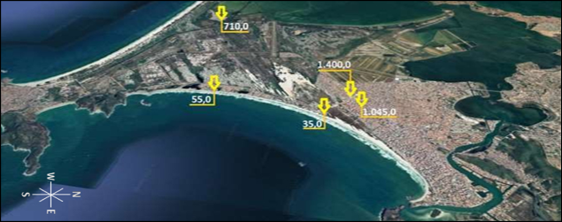 The local climatology during the study period, monitored by the Admiral Paulo Moreira Sea Studies Institute, was characterized by average maximum temperatures of 32°C in summer and 27°C in autumn. As for average minimum temperatures, 24°C was observed in summer and 19°C in autumn. The predominant wind directions in the region were from NE and ENE (northeast and east-northeast), accounting for approximately 70% of the wind frequency in the region. The average wind speed varied between 4.3 m/s and 5.4 m/s in summer and 3.8 m/s and 4.5 m/s in autumn. The average monthly precipitation during the study period was 115 mm in summer and 50 mm in autumn.
