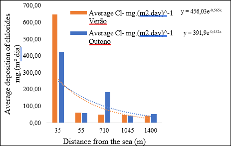For regions with higher wind intensities, up to 18 m.s-1, Morcillo et al. (2000) considered that chloride deposition values below 100 mg.(m².day)-1 characterize a low aggressiveness region, while zones of high aggressiveness are those where depositions higher than 400 mg.(m².day)-1 are observed, emphasizing the relevance of the aggression characteristics specific to microregions.