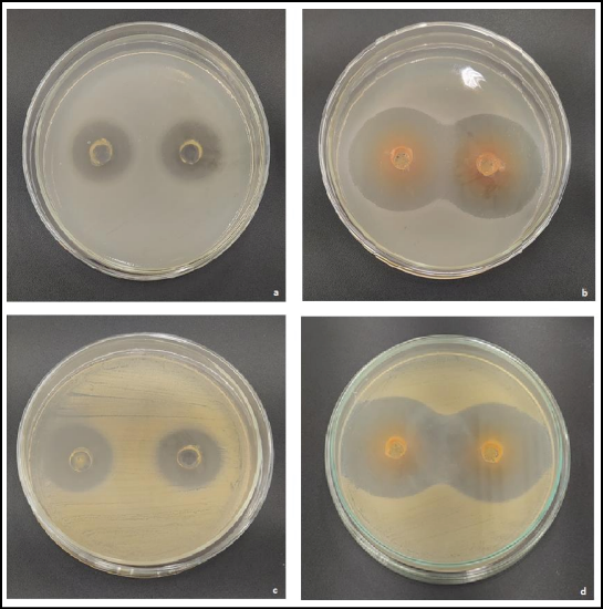 The diffusion technique in a solid medium from an orifice was used to verify the antimicrobial activity of the Vitamin C concentrate obtained by the different drying methods. This technique was performed according to the recommendations of the Clinical and Laboratory Standards Institute (CLSI, 2012b), with some modifications, as suggested by Mohr et al. (2017). The microorganisms of interest at a concentration of 104 CFU/mL were sown in the form of streaks on PCA agar that had already solidified in a petri dish using the surface plating technique with the aid of a disposable swab, sowing in three directions, thus ensuring their complete deposition. In each plate, two equidistant holes were made, using a 1000 μL tip, with a diameter of approximately 8 mm, and approximately 0.15 g of the concentrate was deposited in each hole separately. The plates were incubated at 35±1 oC in a bacteriological oven for 24 h. After this time, the microbial growth inhibition halo formed was measured, with the aid of a millimeter ruler, and this assay was performed in triplicate. For each inhibition halo, the diameter occupied by the antimicrobial agent was discounted.
