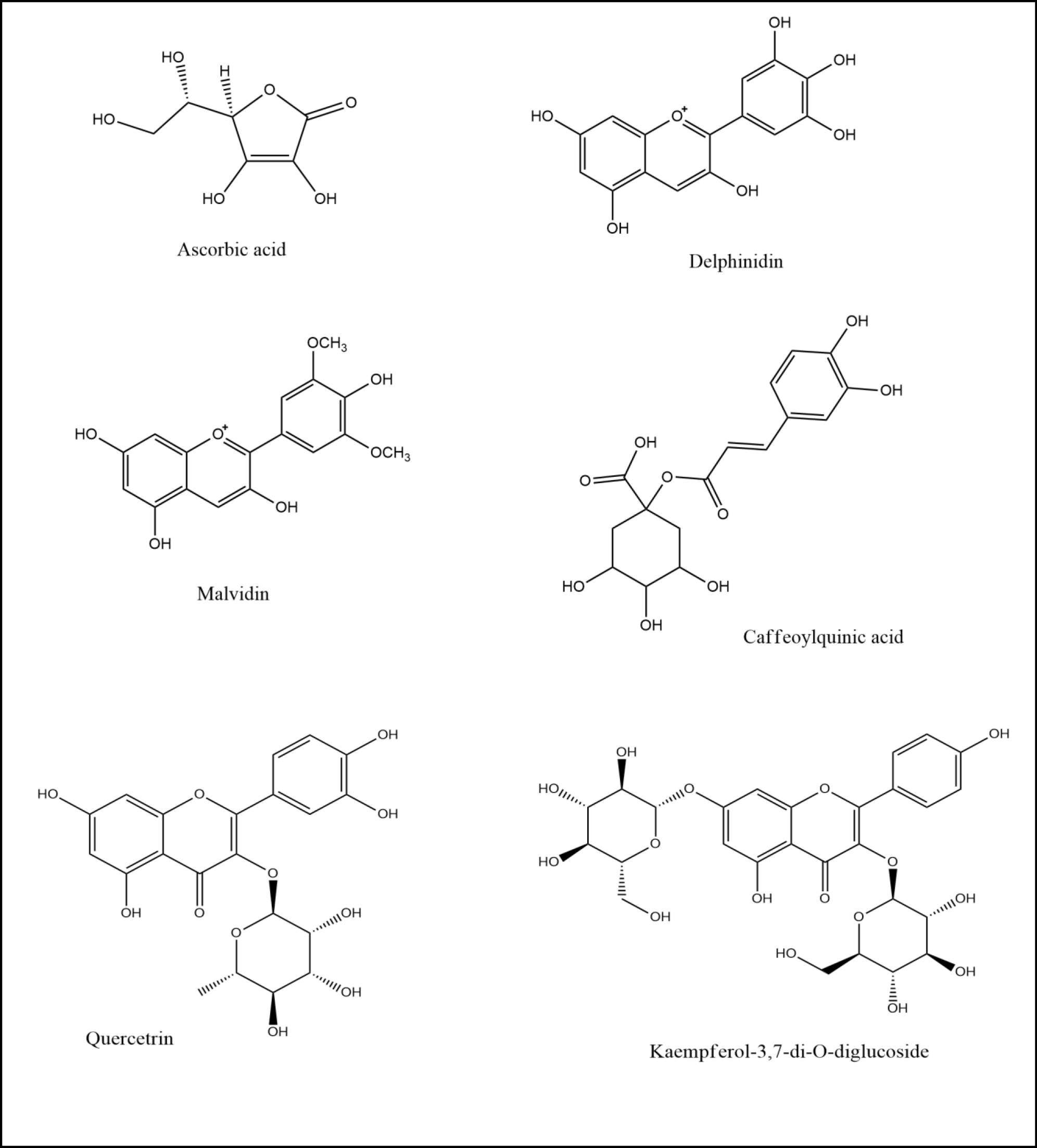 In this study, based on a vitamin C concentrate obtained from the fruits of this plant, phytochemical tests were carried out to characterize the major compounds of this substance. The chemical prospection of the vitamin C concentrate was performed by spectroscopic analysis (ESI-IT-MS), revealing the presence of six compounds, including the anthocyanins named malvidin and delphinidin, recognized in the pigmentation of the species and as important antioxidants (Xu et al, 2020), flavonoids such as quercetin and kaempferol (Lima et al, 2000; Ribani & Amaya, 2008; Macedo et al, 2022); phenolic acids such as caffeoylquinic acid (Almeida et al, 2006; Fereira et al, 2021) and ascorbic acid, an important antioxidant present in large amounts in the fruit (Matta et al, 2004; Mezadri et al, 2006; Cefali et al, 2018; Pires et al, 2022).