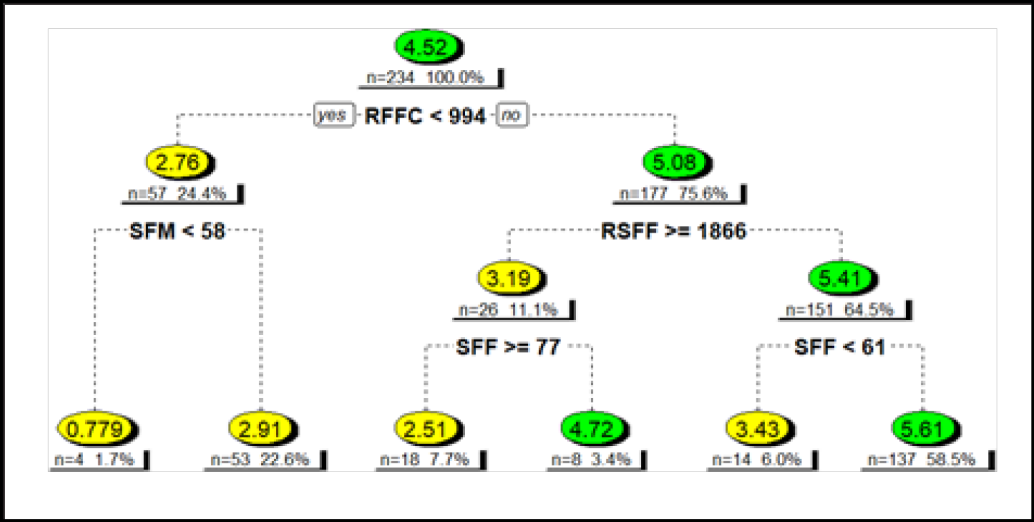 Nos híbridos simples a RFFC foi o principal nó de divisão, enquanto que no segundo nó hierárquico, os critérios de divisão foram SFM e RSFF (Figura 2). A maior média da produtividade de grãos dos híbridos simples (5,61 Mg ha-1) corresponde a uma combinação de uma RFFC superior a 994 MJ m-2, RSFF inferior a 1866 MJ m-2 e a duração da SFF superior a 61 dias (58,5% dos dados). Esses resultados indicam que essa combinação específica de variáveis preditoras promove uma maior produtividade de grãos dos híbridos simples de milho. Nos híbridos triplo, o critério de divisão principal foi a RSFF, conforme indicado no primeiro nó hierárquico (Figura 3). No segundo nó hierárquico, os critérios de divisão foram SFFC e RSFM. Foi observado que os híbridos com um valor de RSFF inferior a 1931 MJ m-2, RSFM maior que 1412 MJ m-2 e SFMC menor que 1039 ºC apresentaram produtividade média de grãos igual a 5,44 Mg ha-1 (63,5% dos dados).
