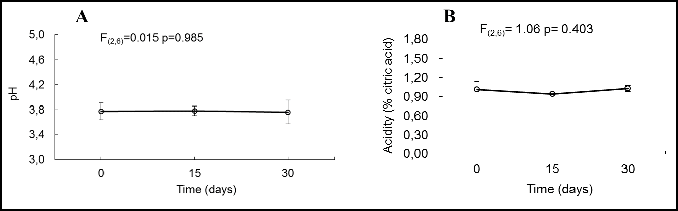 All analyzes of pH, acidity, water activity and color were performed immediately after the elaboration of the candies (time zero) and at times 15 and 30 days of storage at 28 °C ± 2.