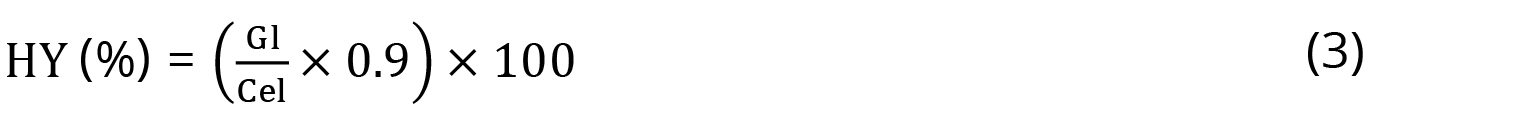 After obtaining the glucose concentration, the hydrolysis yield was calculated, according to Andrade et al. (2019) and Siqueira et al. (2016) (Equation 3).