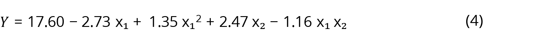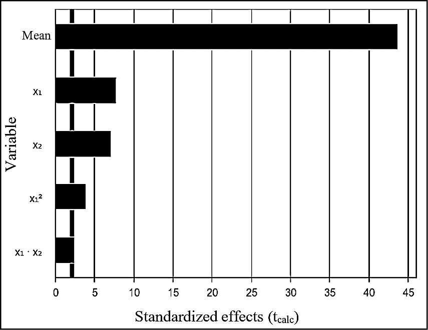 According to Protimiza Experimental Desing software, a mathematical model is considered statistically significant when the Fcal (regression/residues) ≥ Ftab, the Fcal (lack of fit/pure error) ≤ Ftab and the R2 is sufficient. Thus, analyzing the results of the table above, it is verified that the model generated in the regression is significant. The R2 of this model was 91.10% which means that 91.10% of the data were well represented.