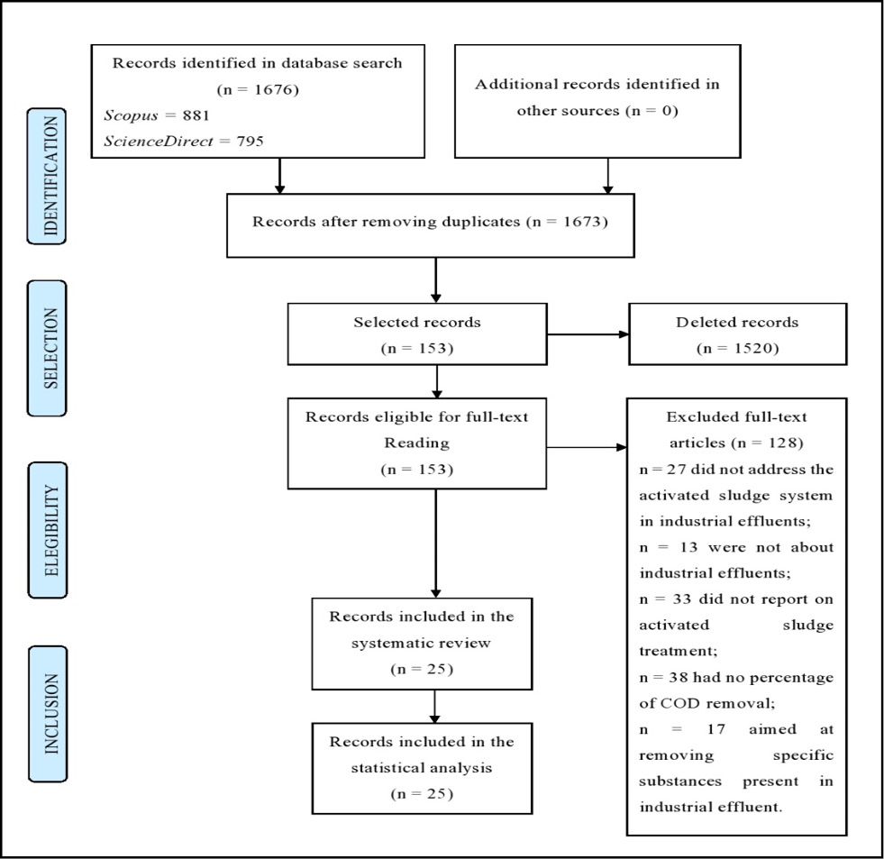 Thus, the following studies were excluded: that did not report industrial waste treatment based on the activated sludge system, that did not address industrial waste, that did not present activated sludge system as, at least, one of the treatment steps, that did not present results of COD removal by activated sludge process and that aimed at removing specific substances from industrial waste.