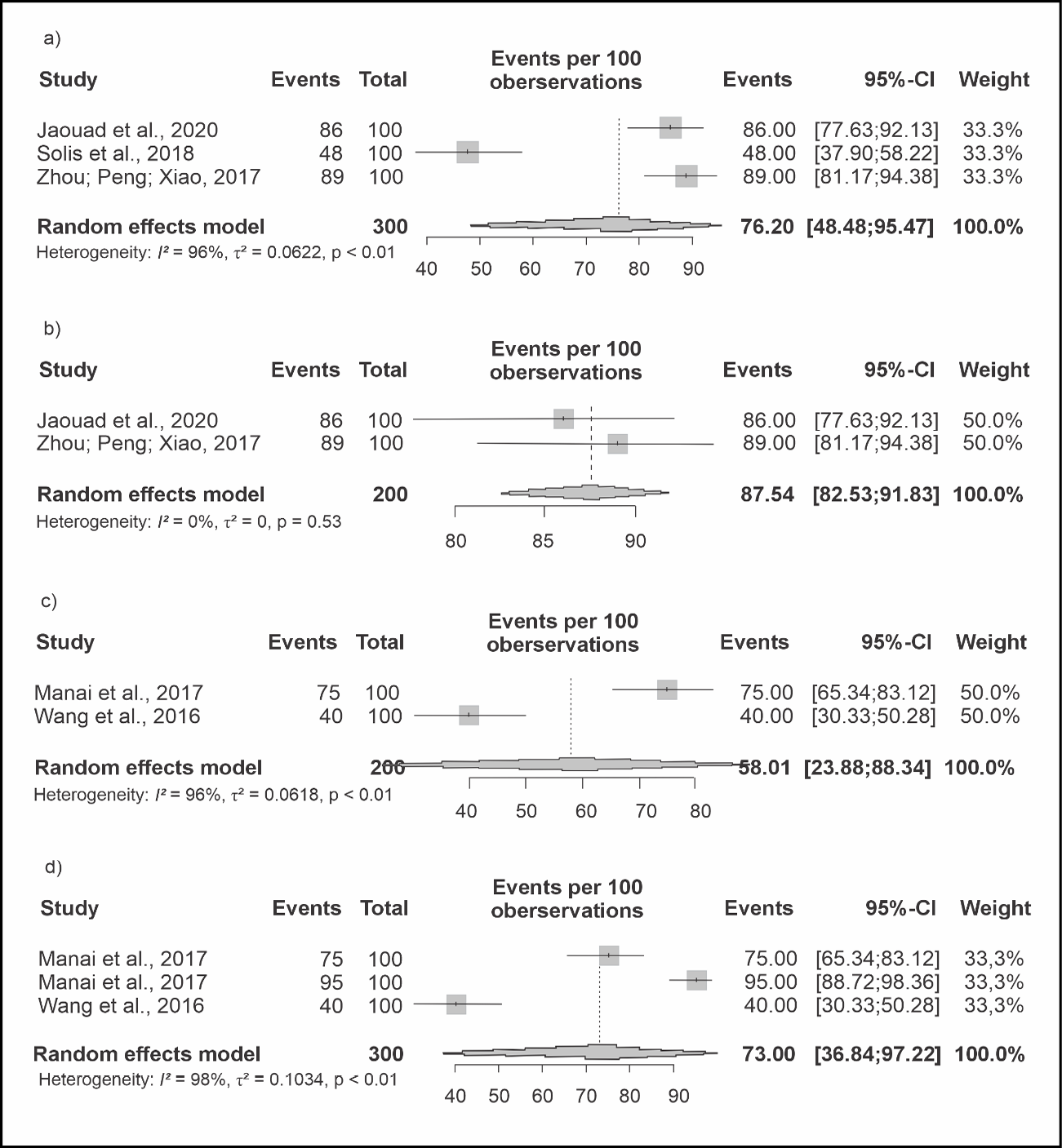 The general package for meta-analysis “meta” version 4.9-5 was used to assess associations between biotechnology treatments by using the “metaprop” command. Forest plot was used for data assessment and representation. Studies’ heterogeneity was assessed in I2 statistic, based on the Q statistic of the Cochran test and on the J number of the analyzed studies. Funnel chart was used to assess the presence of biases in the publications. Fixed and random effect models were used based on the data distribution set for each assessment (Agresti & Coull, 1998; Borenstein et al., 2010; Littell et al., 2008; Arango, 2001; Higgins et al., 2002).