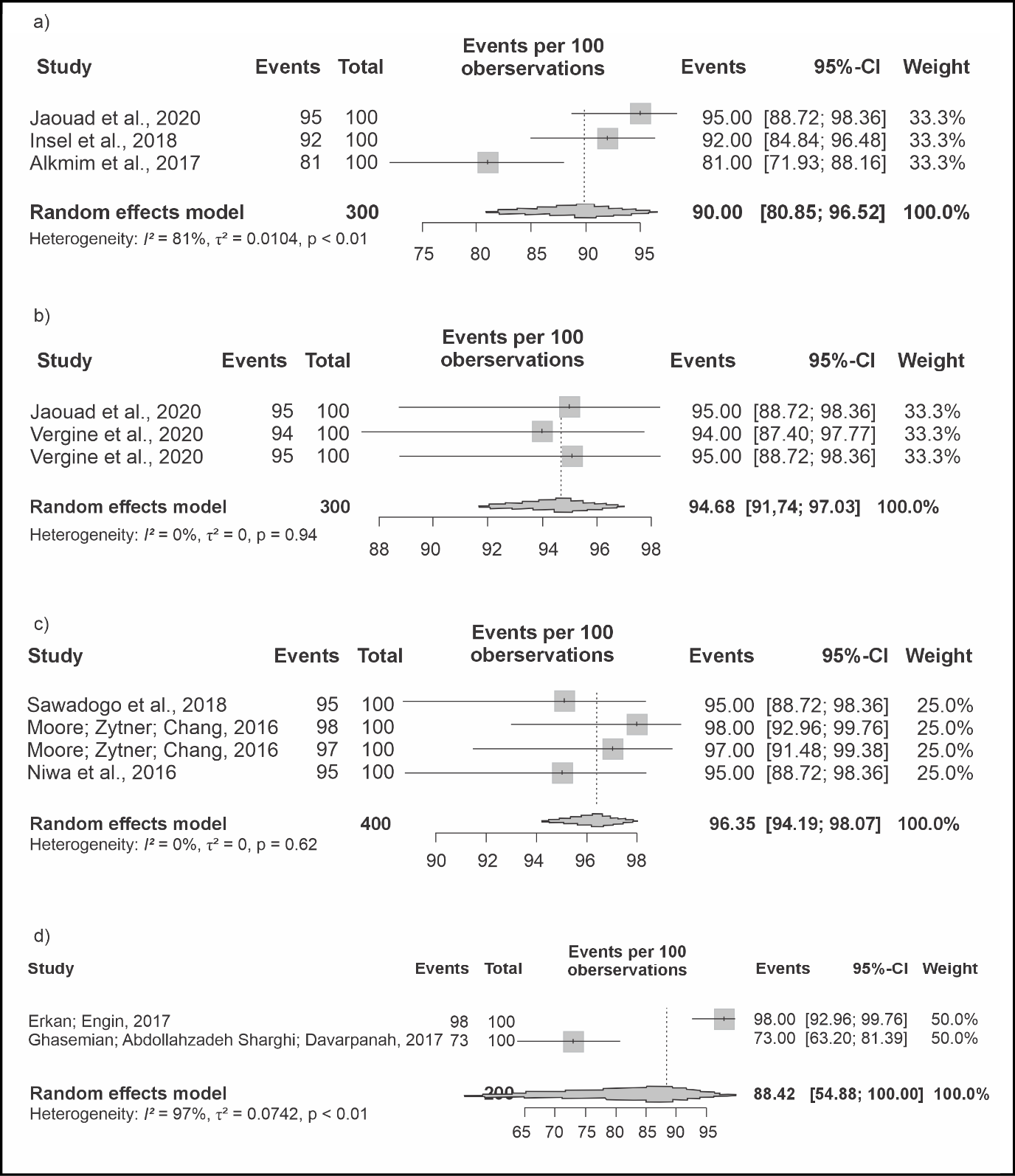 Treatments’ intervention frequency in different regions was also assessed (N = 38) (Table 6). Regions accounting for the three highest analysis frequencies were China, with 15.79% (CI = 4.2 to 27.38); Turkey, with 10.53% (CI = 0.77 to 20.29); and Brazil, Iran, Morocco, Western Africa, with 7.89% (CI = -0.68 to 16.46). Subsequently, Poland, Portugal, Hungary, Singapore and India showed 5.26% frequency (CI= -1.84 to 12.36); the remaining ones reached 2.63% (CI= -2.46 to 7.72) (p = 0.67).