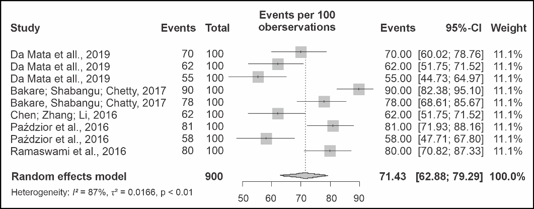 Prevalences followed the same distribution order and they pointed towards the prevalence of regions among all those described in this present study (N = 17), starting from 35.29% (CI = 12.57 to 58.01) recorded for China, which was followed by 23.53% (CI = 3.37 to 43.69) recorded for Turkey; by 17.65% (IC = -0.47 to 35.77) recorded for Brazil, Iran, Morocco, Western Africa; by 11.76% (IC = -3.55 to 07.27) recorded for Poland, Portugal, Hungary, Singapore and India; the other regions reached 5.88% (CI = -5.30 to 17.06) (p=0.67).