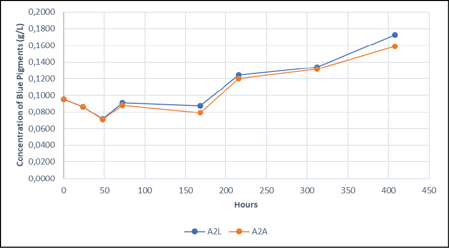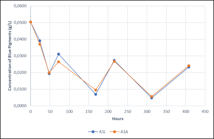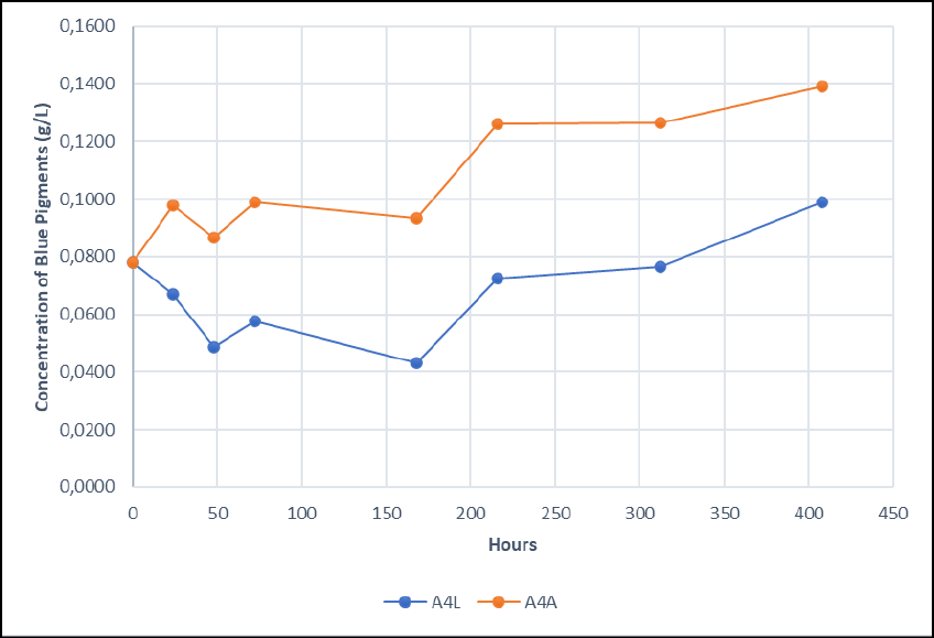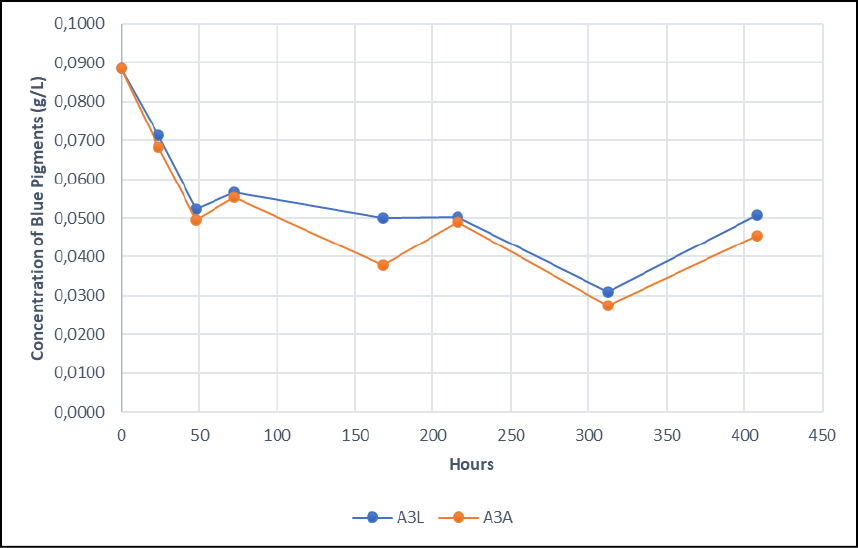 The similarity of the behavior of both conditions regarding exposure to light also remains in sample 3. With its phases marked by loss of concentration and followed by partial recovery. However, the final concentration of the blue pigments in this sample showed a reduction of approximately 52% from the initial value.