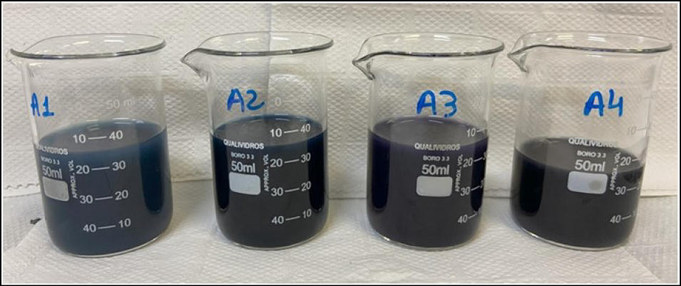 The dyes were obtained by extraction with two different types of solvents, distilled water and 50% ethanol pH 4.0, for Renhe et al. (2009) and confirmed by (Figure 1), the samples extracted in ethanol (A3 and A4) obtain a more intense and darker colouration than those extracted in distilled water. However, glutamic acid was added to aid in the stabilization of the blue pigment in samples A2 and A4, where it is possible to notice that the intensity of the pigment increases, resembling the dye extracted with etanol.