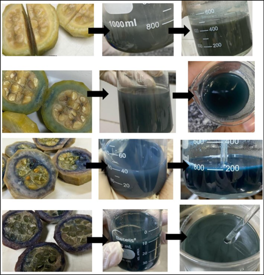 It is important to highlight the difficulty in the uniformity of the blue tone in water extractions. It was observed in this study that the degree of oxidation of the fruit as soon as it breaks has a direct influence on the colour of the dye obtained, even with the addition of glutamic acid (Figure 2).