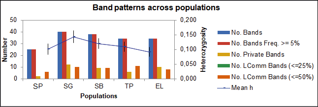This number of data allowed us to identify and analyze many loci (172), as can be seen in Figure 2, which shows the banding patterns for the different populations, including total number of bands, common bands, unique bands, and diversity.