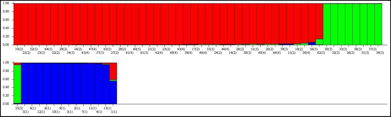 Figure 4 – Genetic structure of the five Trifolium polymorphum populations with the formation of three clusters. Blue (1) = Eldorado do Sul. Red (2) = Tupanciretã; São Pedro do Sul, São Borja. Green (3) = São Gabriel