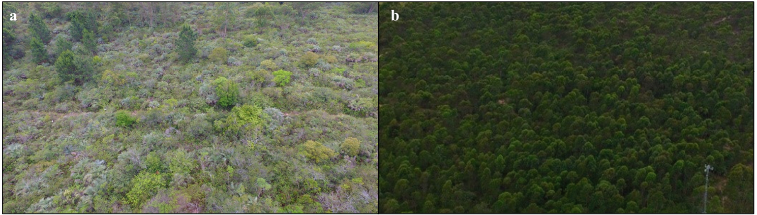 Figure 2 – General view of the study area characterized by shrubby Restinga in an intermediate stage of succession (a), located in the municipality of Içara, and Restinga associated with eucalyptus monoculture (b), in the municipality of Balneário Rincão, southern Santa Catarina, Brazil