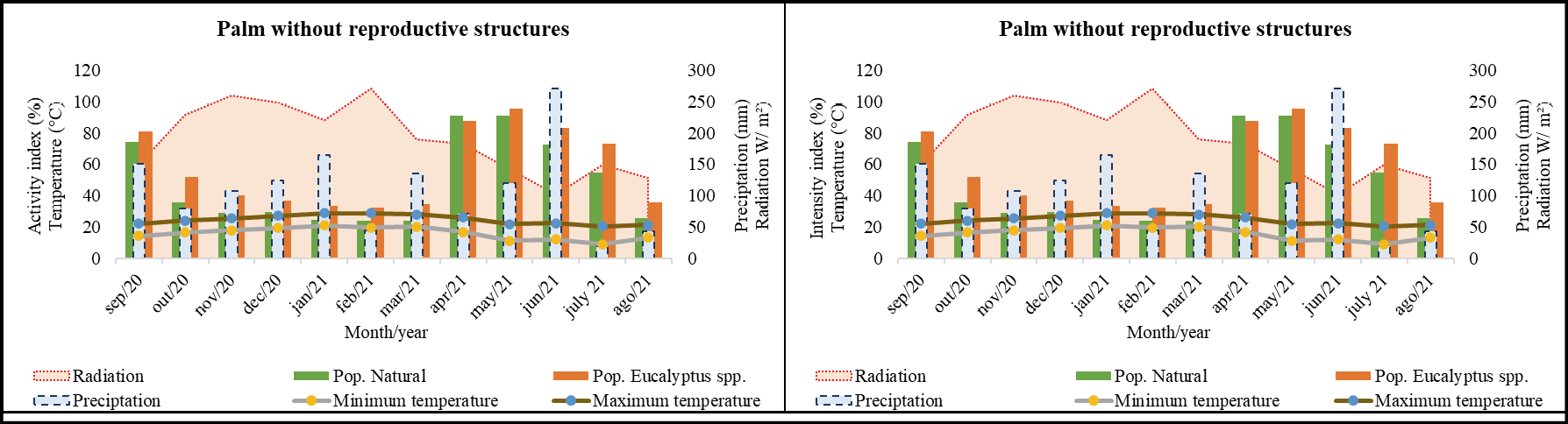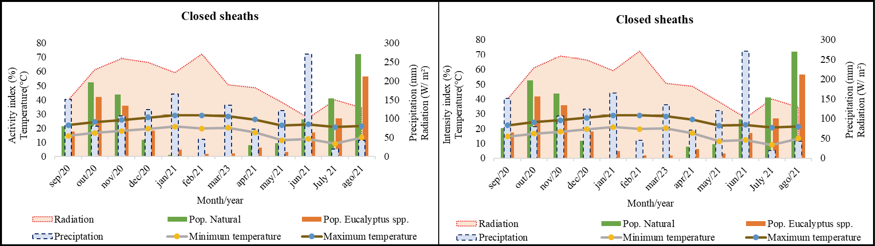 The peak activity of closed sheath emission occurred in August for both populations, however, in the natural environment, the B. catarinensis population showed synchrony with 68% Activity Index (AI) while in the population associated with eucalyptus monoculture it showed less synchrony compared to the natural environment with 49% AI (Figure 4). The occurrence of this phenophase showed a negative correlation only in the natural population for the variable average maximum temperature. Although significant, it is considered a regular correlation (0.3 >τ <0.6) according to the parameters established by Callegari-Jacques (2011). The correlation between the occurrence of closed sheaths emission with this same variable in the population associated with eucalyptus monoculture was considered a weak negative correlation (τ= -0.233; p=0.299).