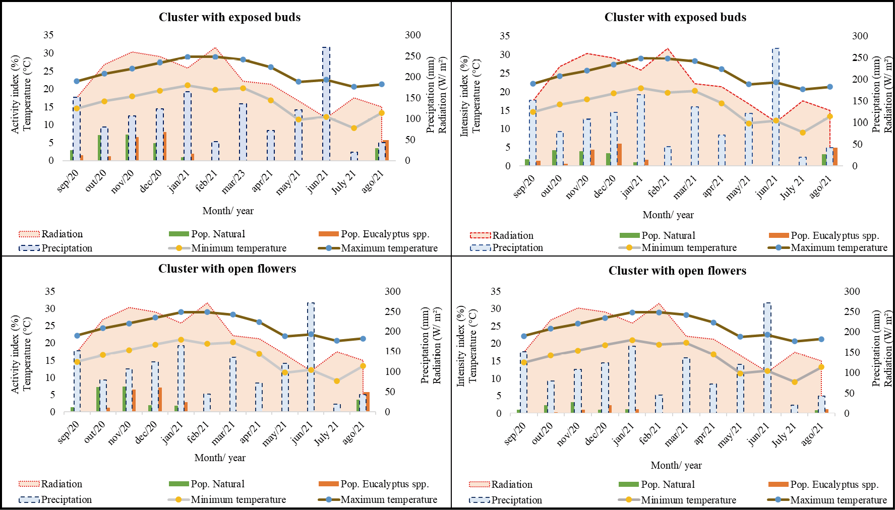 From the 65 individuals sampled in each population, 58 (89%) in the natural population and 45 (69%) in the population associated with eucalyptus monoculture exhibited at least one of the phenophases during the monitored period. The others did not present reproductive structures during the evaluated period.