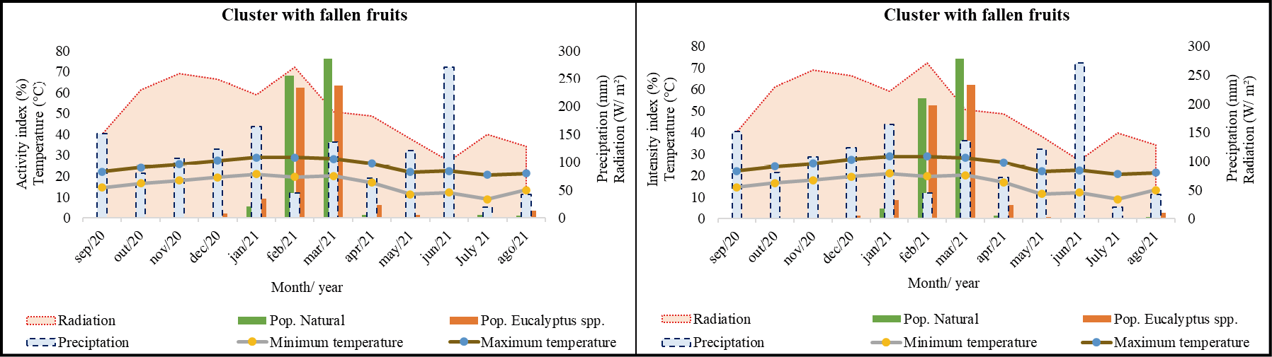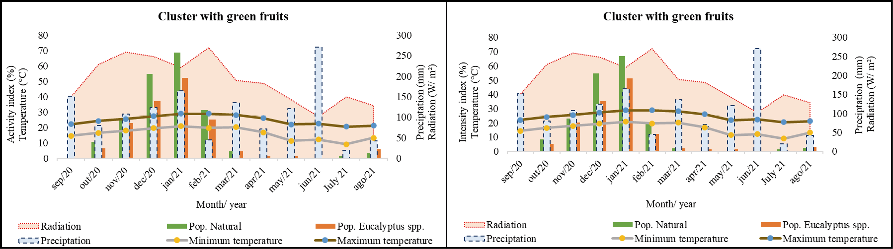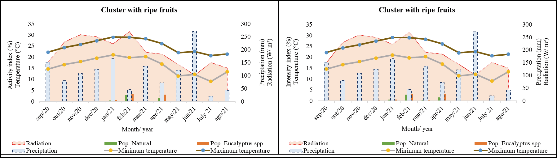 The absence of significant correlations between the phenophases of flowering and climatic variables suggests that other factors may also play a role in initiating and developing these phenological events; in this study, entomophilous pollination stands out as a potential influencing factor in flowering. Furthermore, it is noted that precipitation had little influence on the reproductive cycle of this species. In contrast, higher temperature values (minimum and maximum), as well as high levels of solar radiation, positively influenced the development of clusters with green fruits and clusters with ripe fruits throughout the year.