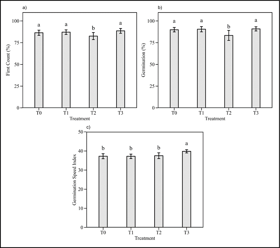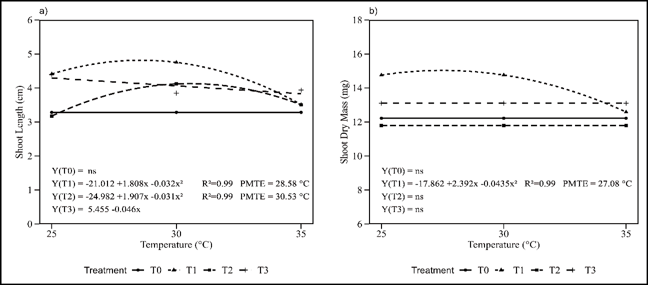 The analysis of variance revealed a significant interaction between Treatments and Temperatures for the variables shoot length and shoot dry mass (Table 1). On the other hand, for the variables first germination count, germination and germination speed index, significant effects were observed in isolation for both Treatment and Temperature.