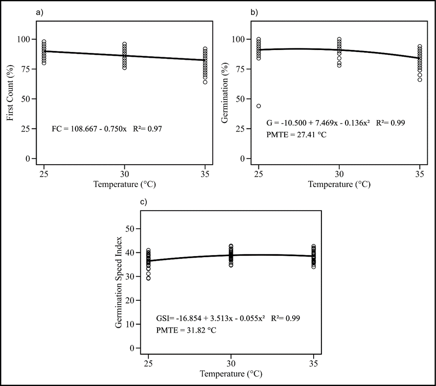The quadratic responses for germination and germination speed index indicate complexity; the continuous increase in temperature can have adverse effects, highlighting the importance of finding the ideal temperature to optimize these variables, since seeds have maximum germination at temperatures that are considered optimal and are specific to each species.