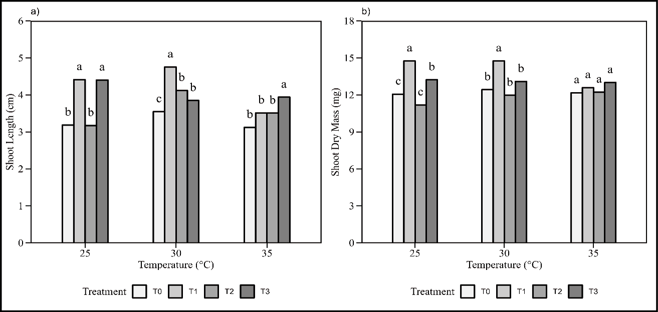When analyzing the effects of the seed treatments on the length of the shoot, for each of the temperatures studied, the highest values were observed for treatments T1 and T3 for the temperature of 25 °C, but without differing from each other (Figure 3a). At 30 °C, the highest and lowest shoot length values were obtained with treatments T1 and T0, respectively. At a temperature of 35 °C, T3 was superior to the other seed treatments, while T0, T1 and T2 did not differ.