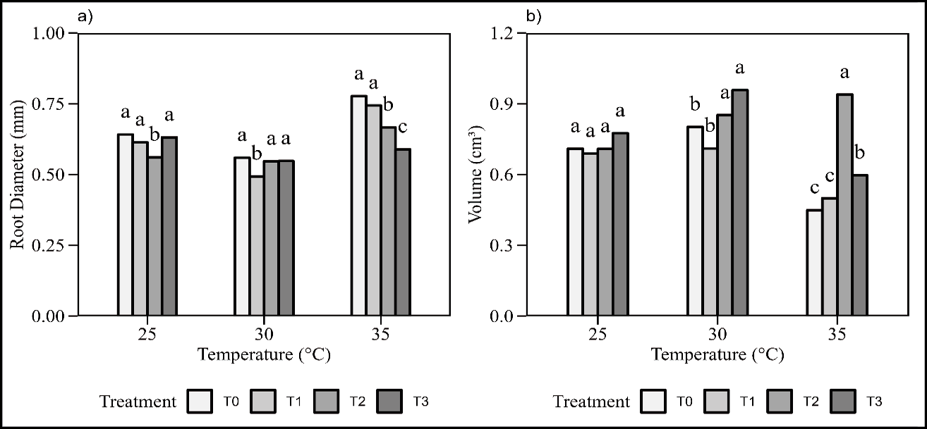 Treatments T0, T1 and T3 resulted in the highest root diameter values at 25 °C, which were similar to each other (Figure 6a), while at 30 °C the treatment with AllRefresh= alone (T1) resulted in a reduction in diameter. At 35 °C, the largest diameters were observed in treatments T0 and T1. On the other hand, treatments T2 and T3 resulted in smaller root diameters. These smaller diameter results may be of interest to seedlings, as plants with thinner and longer roots may have the potential to explore a greater volume of soil, as they have a greater surface area of the root system (Marschner, 1995), without as much carbon investment on the part of the plant.
