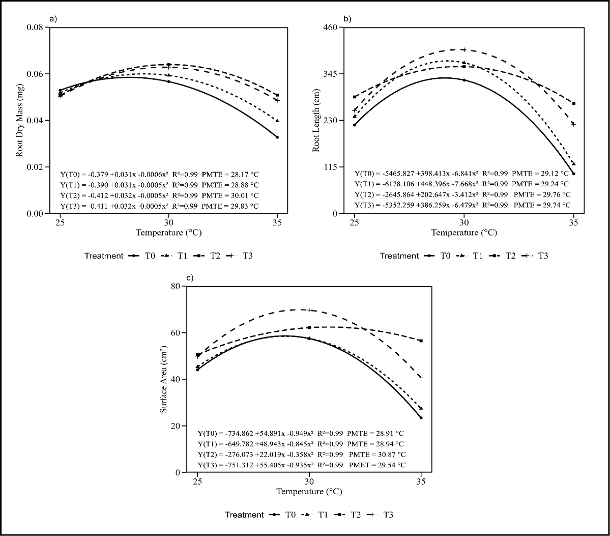 The temperatures that resulted in PMTE for root length were 29.12, 29.24, 29.76 and 29.74 °C, for treatments T0, T1, T2 and T3, respectively (Figure 7b). For the root surface area, the temperatures 28.91, 28.94, 30.87 and 29.54 °C were estimated as the MET points, for the treatments T0, T1, T2 and T3, respectively (Figure 7c).