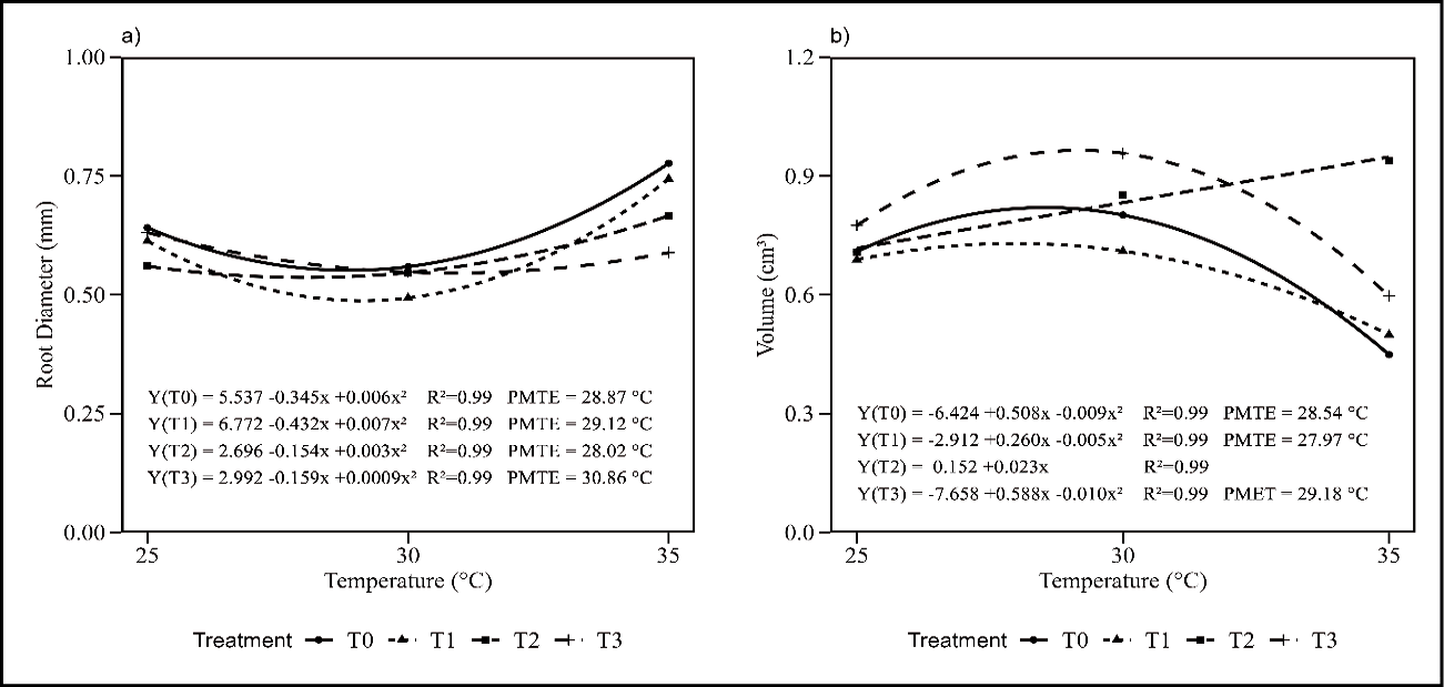 The root diameter showed a quadratic response to the increase in temperature for all the treatments studied (Figure 8a). Contrary to the other variables, minimum points were obtained, i.e. the temperatures that caused the lowest diameter values, which were 28.87, 29.12, 28.02 and 30.86 °C for treatments T0, T1, T2 and T3.