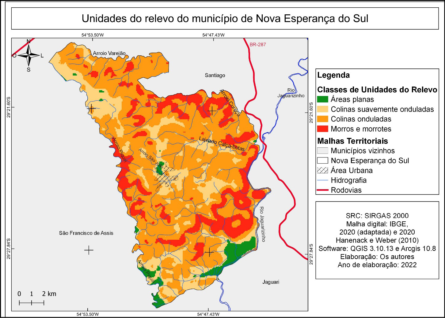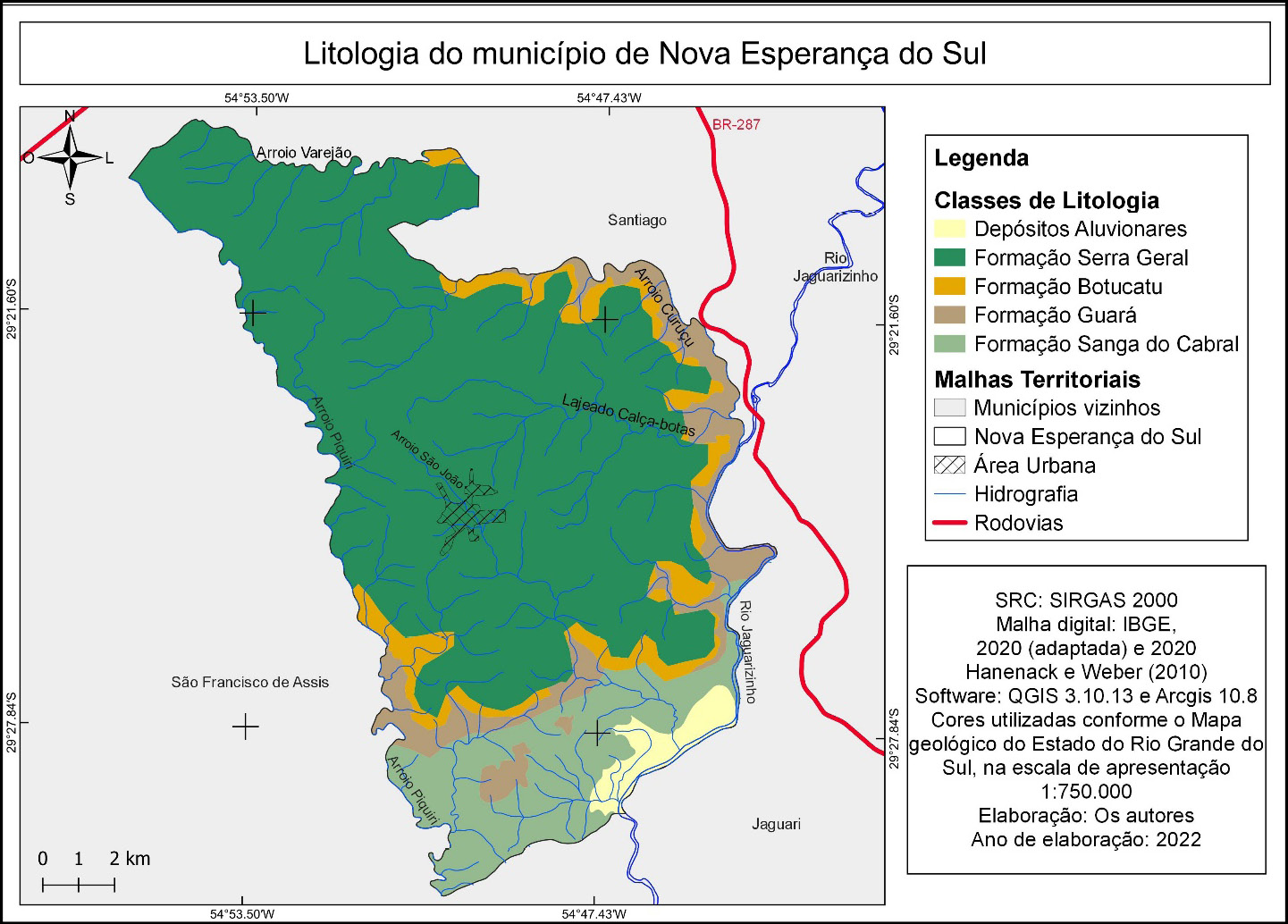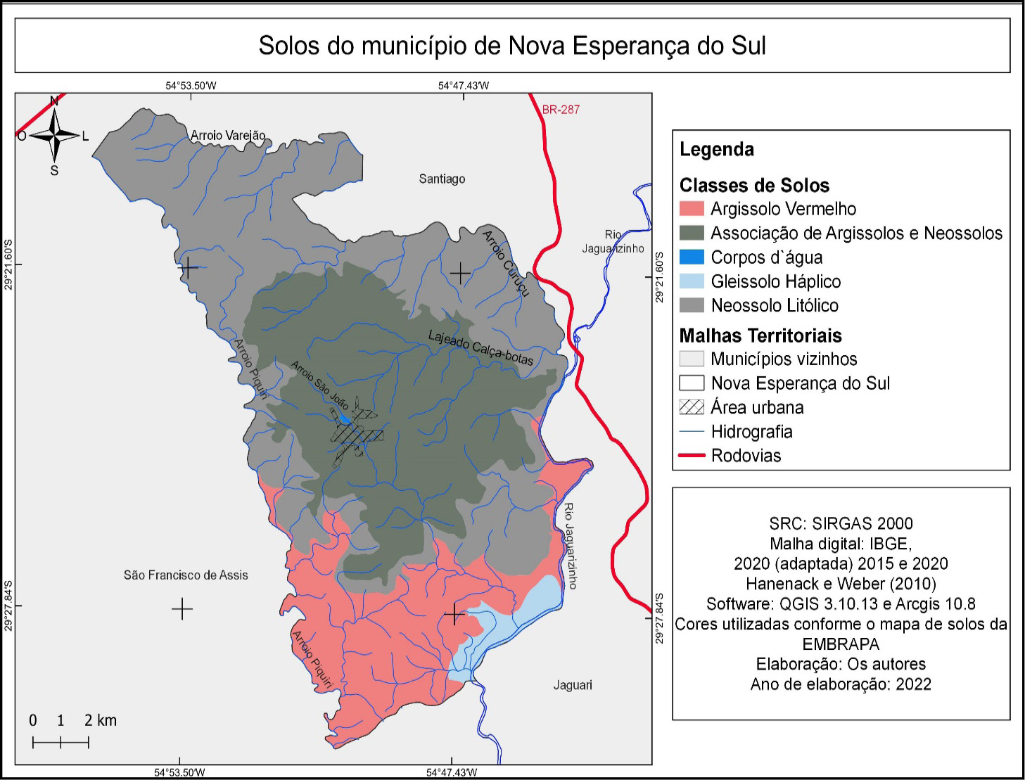 Na elaboração do mapa de localização foram utilizadas as malhas digitais do Instituto Brasileiro de Geografia e Estatística (IBGE) nos anos de 2016 e 2019, e a Base Vetorial Contínua do Estado do Rio Grande do Sul, com escala 1:50.000, organizada por Hasenack e Weber (2010). A base cartográfica para análise dos solos refere-se às malhas digitais do IBGE (2015 e 2020), na escala de 1:250.000. Os trabalhos de campo permitiram qualificar os limites de cada classe de solo, através de análise de variações de textura e estrutura em perfis de cortes de estradas. As litologias foram definidas com base nos trabalhos de campo executados no município de Nova Esperança do Sul, bem como municípios limítrofes e referidos pelas Formações Geológicas no Mapa Geológico do Rio Grande do Sul (CPRM, 2008) com escala de 1:750.000.
