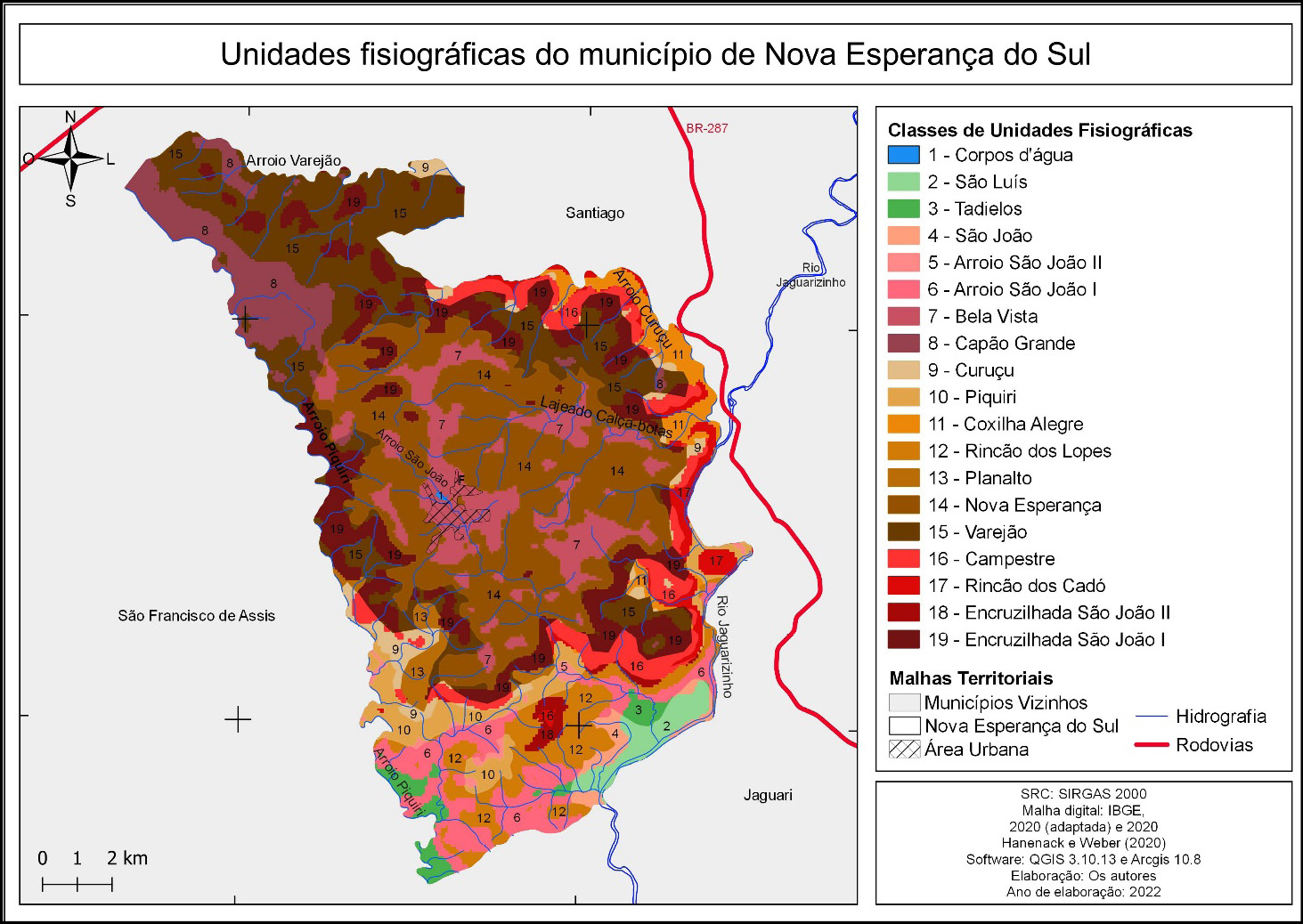 Para o processamento desses mapas, foi utilizado SIG ArcGIS 10.8, licenciado para o Programa de Pós-graduação dos autores. A finalização do layout foi realizada no QGIS 3.10.13. As unidades fisiográficas do município representam o contexto da paisagem atual do município, com o mapeamento em escala de 1:250.000.