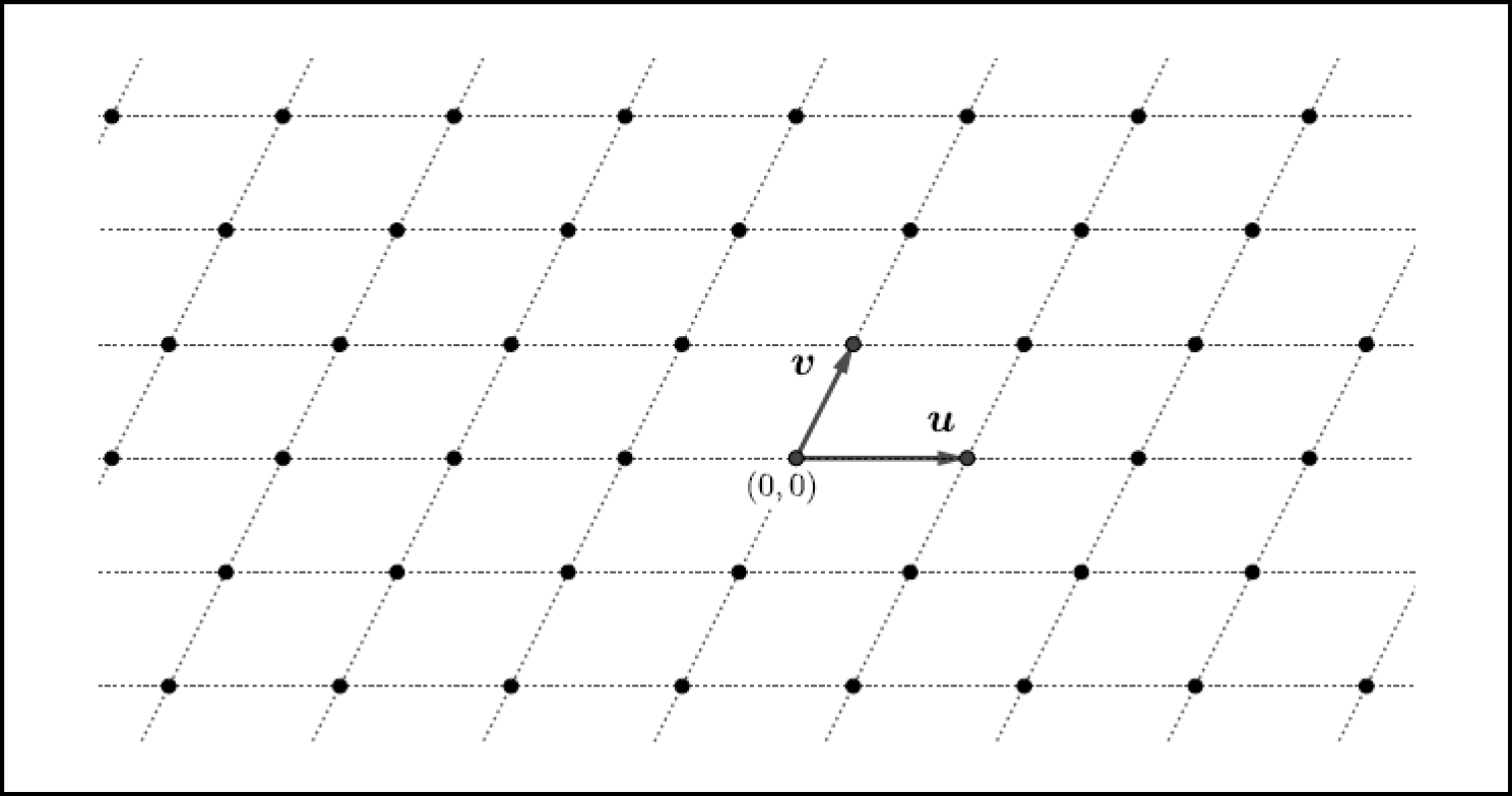 Um subconjunto Λ ⊂ ℝ2 é dito um reticulado (bidimensional) se existirem vetores linearmente independentes 𝑢 e 𝑣 de modo que ele seja constituído pelas combinações lineares inteiras de 𝑢 e 𝑣, ou seja, Λ = {𝑎𝑢 + 𝑏𝒗; 𝑎, 𝑏 ∈ ℤ}, Conway & Sloane (2013). Neste caso, o conjunto {𝑢, 𝑣} é denominado uma base de Λ. Na Figura 1 encontra-se ilustrado o reticulado Λ gerado pela base {𝑢 = (3,0), 𝑣 = (1,2)}, isto é, Λ = {(3𝑎 + 𝑏, 2𝑏); 𝑎 e 𝑏 são inteiros}.
