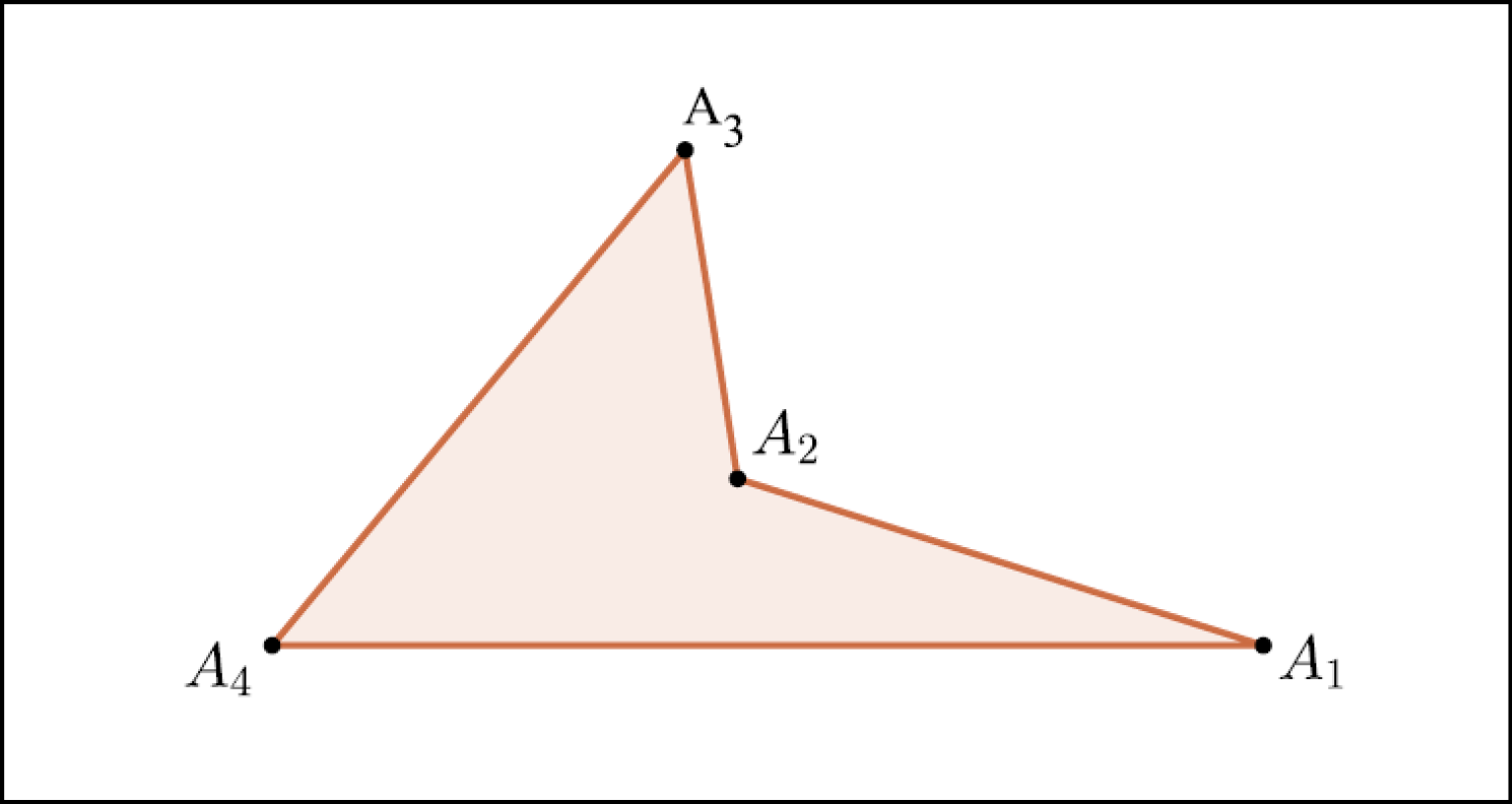Sejam 𝐴1,𝐴2 . . . ,𝐴𝑛, com 𝑛 ≥ 3, pontos distintos no plano cartesiano. A região delimitada pela lista de segmentos 𝐴1𝐴2, 𝐴2𝐴3,. . . ,𝐴𝑛−1𝐴𝑛 e 𝐴𝑛𝐴1, incluindo eles, é denominada um polígono simples, desde que quaisquer dois segmentos dessa lista que tenham uma extremidade comum não estejam contidos na mesma reta e, exceto possivelmente em suas extremidades, nenhum par de segmentos se intersecta. Os segmentos 𝐴1𝐴2, 𝐴2𝐴3, . . . ,𝐴𝑛−1𝐴𝑛 e 𝐴𝑛𝐴1 e os pontos 𝐴1𝐴2, . . . , 𝐴𝑛 são chamados de lados e vértices do polígono, respectivamente. Dado um polígono simples P contendo quatro ou mais vértices, um segmento que conecta dois vértices não adjacentes é denominado uma diagonal de P se ele está contido em P e não contém outro vértice de P. Na Figura 2 encontra-se ilustrado um políıgono simples que possui quatro vértices, o segmento 𝐴1𝐴4 é uma diagonal de P enquanto que 𝐴1𝐴3 não é uma diagonal.