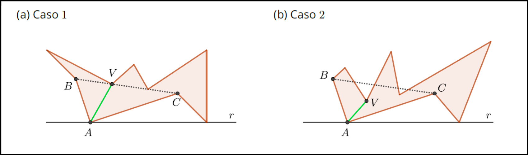 Demonstração. Sejam 𝑘 ≥ 4 um inteiro, 𝑃 um polígono cujos vértices são 𝐴1(𝑥1, 𝑦1), . . ., 𝐴k (𝑥𝑘, 𝑦k) e 𝑟 (Figura 3). Sejam 𝐴 um vértice de 𝑃 que pertence à reta 𝑟 e, 𝘉 e 𝐶 os vértices de 𝑃 que são adjacentes ao vértice 𝐴. Se o segmento 𝘉𝐶 é uma diagonal de 𝑃, tem-se o resultado. Resta, então, analisar o caso em que 𝘉𝐶 não é uma diagonal de 𝑃. Se não existem vértices de 𝑃 no interior do triângulo 𝐴𝘉𝐶 e 𝑉 é um vértice qualquer de 𝑃 que pertence ao segmento 𝘉𝐶, então o segmento 𝐴𝑉 é uma diagonal de 𝑃 (Figura 3a). Se, porém, existem vértices de 𝑃 no interior do triângulo 𝐴𝘉𝐶 e 𝑉 é um vértice de 𝑃 no interior do triângulo cuja ordenada é a menor dentre todas as possibilidades, então o segmento 𝐴𝑉 é uma diagonal de 𝑃 (Figura 3b).