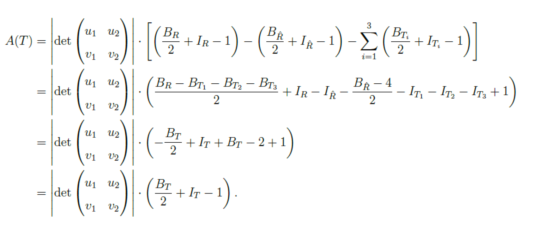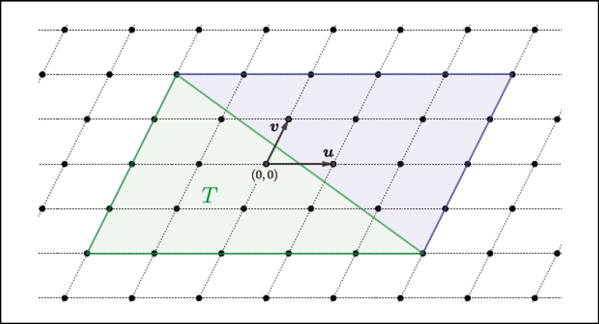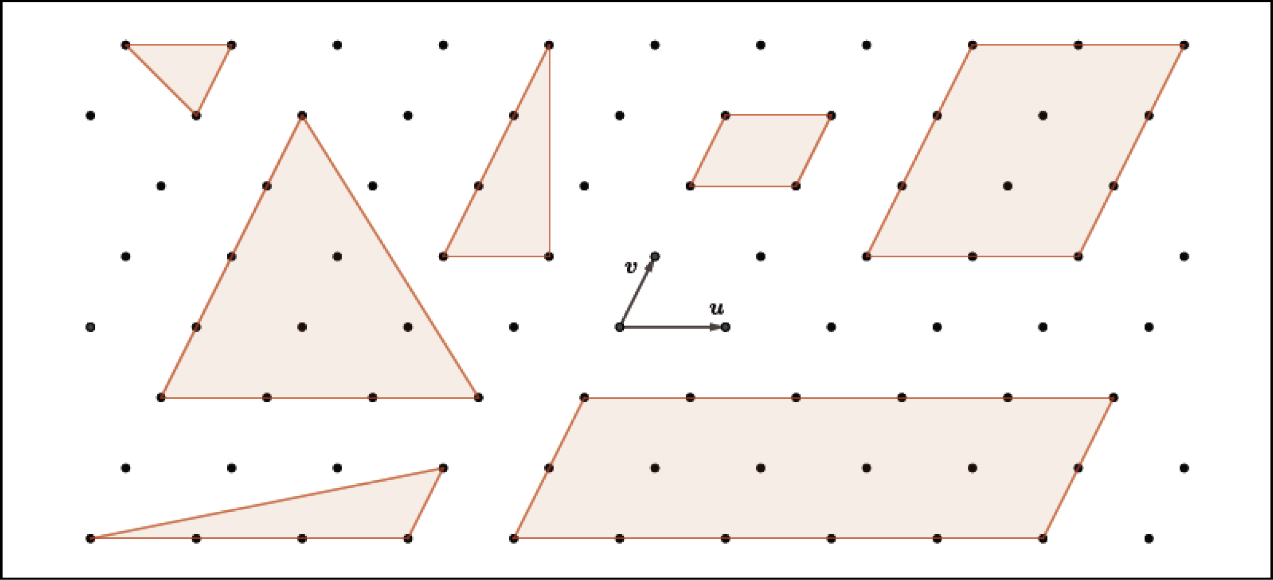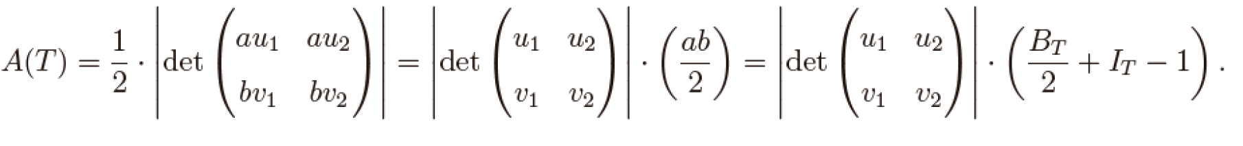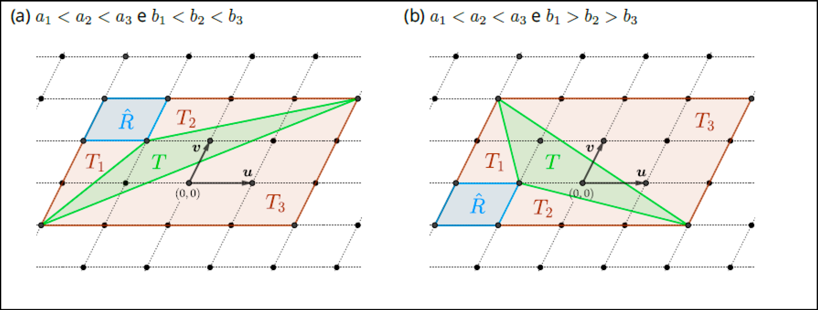 Lema 4. Sejam Sejam Λ ⊂ ℝ2 o reticulado gerado pela base {𝑢 = (𝑢1, 𝑢2), 𝑣 = (𝑣1, 𝑣2)} e 𝑇 um triângulo qualquer cujos vértices pertencem a este reticulado. Então, área de 𝑇 é dada por
