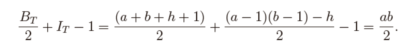 O número de pontos do reticulado no interior de 𝑅 é igual a (𝑎 – 1) (𝑏 – 1), pois os pontos estão dispostos em 𝑏 – 1 fileiras paralelas ao vetor 𝑢, cada uma contendo 𝑎 – 1 pontos. Assim, 𝐼𝑇 = [(𝑎 – 1) (𝑏 – 1) – h]/2. Por outro lado, tem-se 𝐵𝑇 = 𝑎 + 𝑏 + h + 1. Logo,