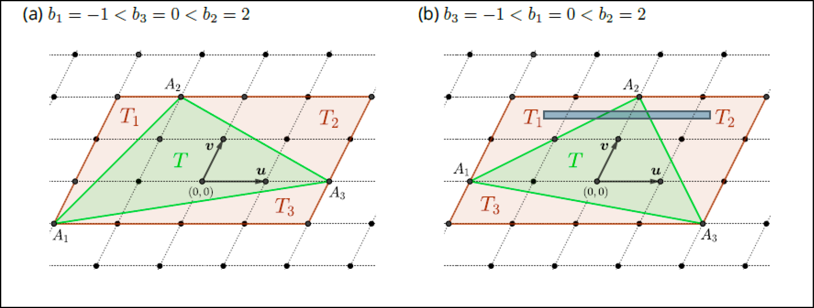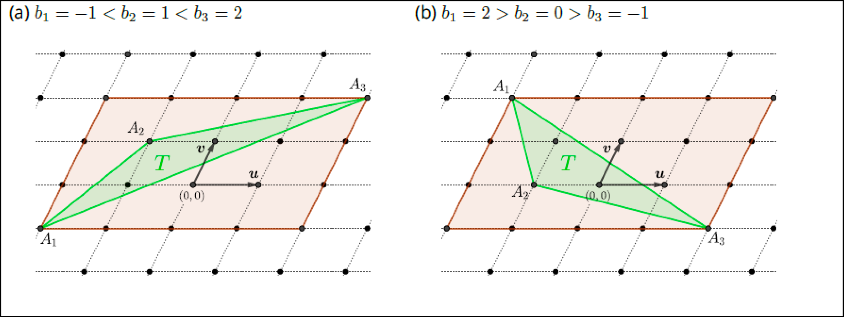 O segundo e último caso é quando nenhum dos lados de 𝑇 é paralelo ao vetor 𝑢 e nem ao vetor 𝑣. Este, por sua vez, será dividido em dois subcasos, os quais serão descritos mais adiante. Denote os vértices de 𝑇 por 𝐴1,𝐴2 e 𝐴3. Digamos que 𝐴1,𝐴2 e 𝐴3 estão localizados nos elementos do reticulado, respectivamente. Como nenhum dos lados de 𝑇 é paralelo ao vetor 𝑢 e nem ao vetor 𝑣, tem-se