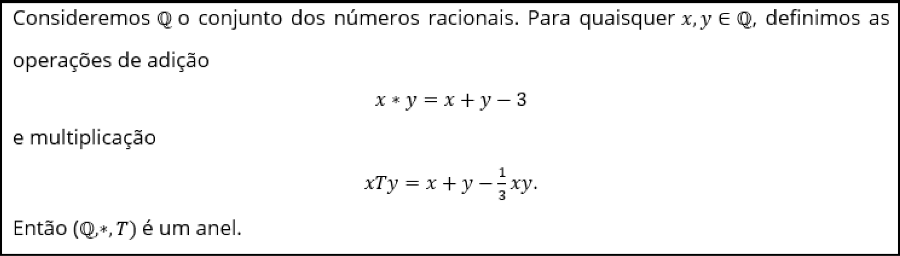 Ressaltamos, também, a importância de se observar que o elemento neutro aditivo pode não ser zero, bem como a unidade pode não ser , trabalhando efetivamente com a definição de ambos. Esse tipo de situação pode ampliar a visão do aluno sobre o conteúdo, permitindo que ele explore, ou até mesmo perceba que existem outros tipos de operações, além da adição e multiplicação usuais.