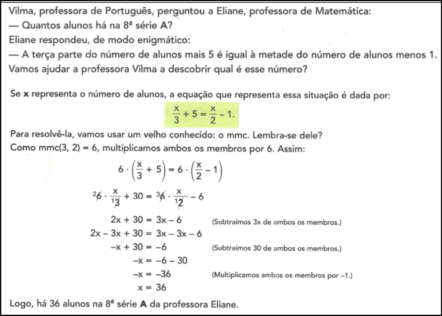 Vejamos, agora, a solução de uma equação com base em uma situação problema apresentada para o 8º ano do ensino fundamental (figura 7).