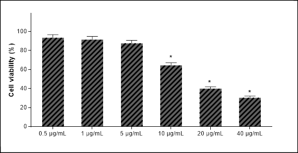 Figure 2 – In vitro cell viability by MTT assay in HT-29 cell line after 72 h of treatment. Data are expressed as the mean of three independent experiments ± SE. Statistical analyses were performed using ANOVA. * Indicates significant difference from the control cells (p < 0.05)