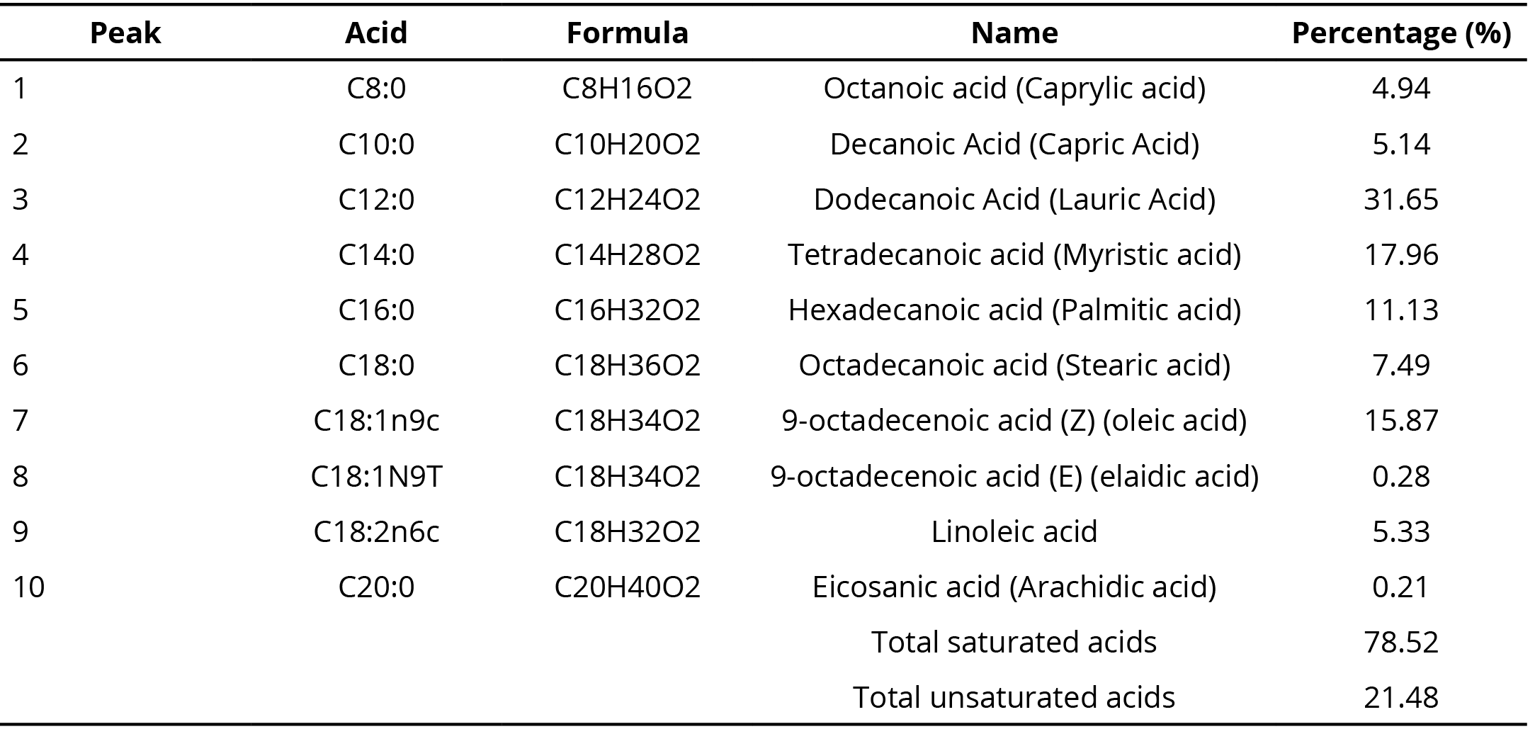 The chemical composition of ariri coconut oil was performed in a gas chromatograph (CG-2010) with Shimadzu Flame Ionization Detector (CG-FID), using a ZB-FFAP capillary column (30m x 0.25mm x 0.25μm). The flow of the carrier gas, helium, at a linear velocity of 47.5 cm/sec and column flow of 1.0 mL/min. The furnace programming was 120 °C for 2 min with a heating ramp from 10 °C/min to 180 °C and remained for 5 min, being heated again at a rate of 3 °C/min to 230 °C, remaining for up to 3 min. The injector and ion source temperatures were 250 °C and 200 °C, respectively. Split injection mode with 1/100 ratio. Race Time 32.67 min.