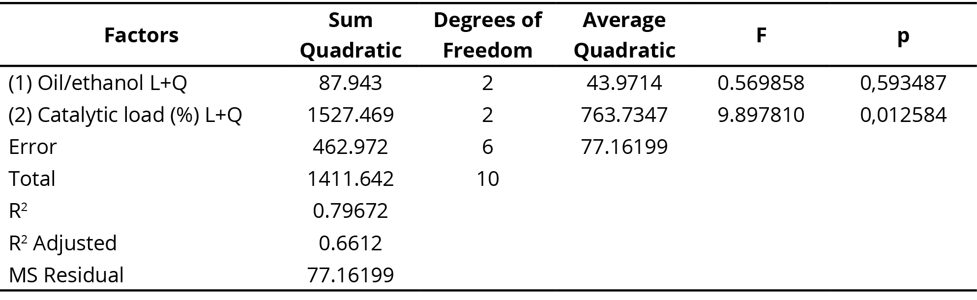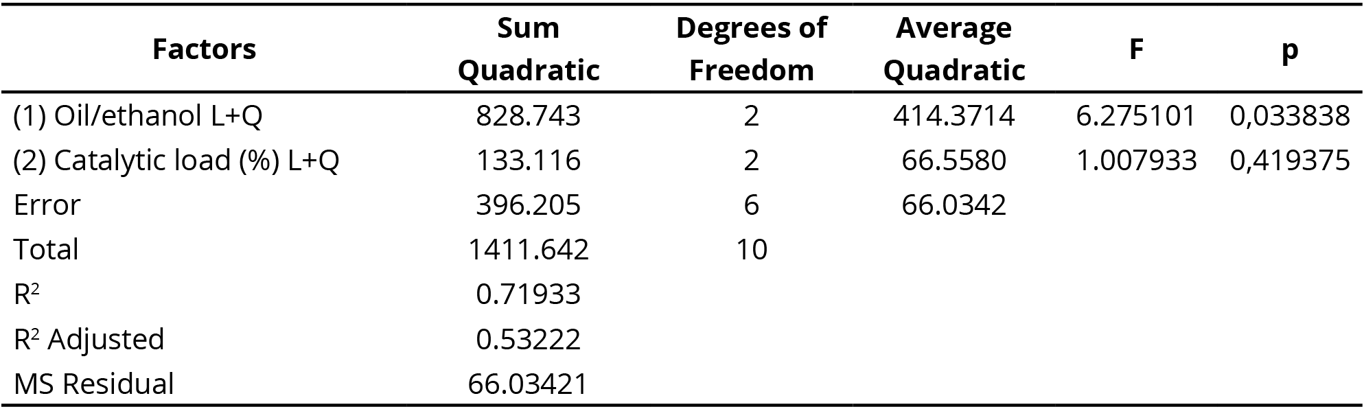 The experimental data were analysed through analysis of variance (ANOVA) with a confidence level of 95%, with significant terms p < 0.05 and the optimisation of the synthesis of esters performed through the response surface analysis (MSR) methodology provided by the Statistica software.