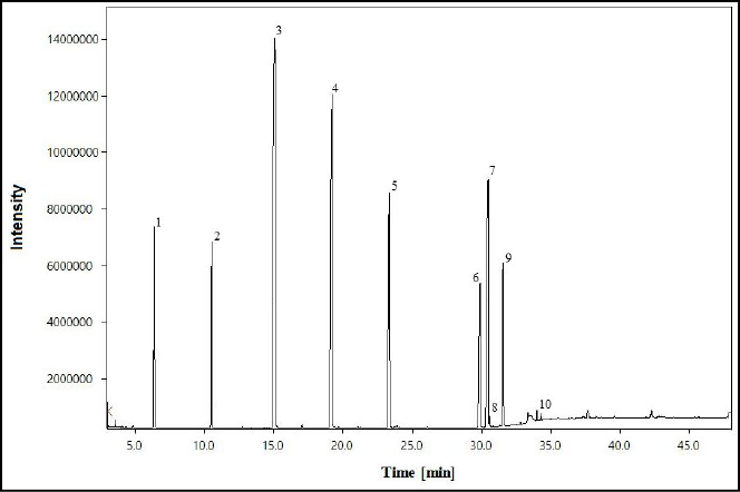The analyses of the reaction products were conducted in a Shimadzu Gas Chromatograph with Mass Spectrometer (GCMS-QP2010 SE), using an RXi1MS capillary column (30m x 0.25mm x 0.25μm). The flow of the carrier gas, helium, at a linear velocity of 37.5 cm/sec and column flow of 1.0 mL/min. The furnace programming was 120 °C for 2 min with a heating ramp from 10 °C/min to 180 °C and remained for 3 min, being heated again at a rate of 5 °C/min to 280 °C, remaining until 2 min. The injector and ion source temperatures were 250 °C and 200 °C, respectively. Split injection mode with a 1/50 ratio. Running time 33 min.