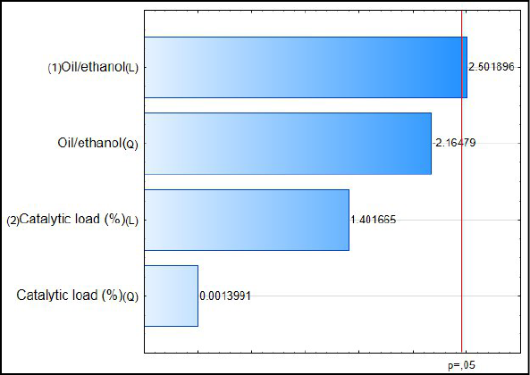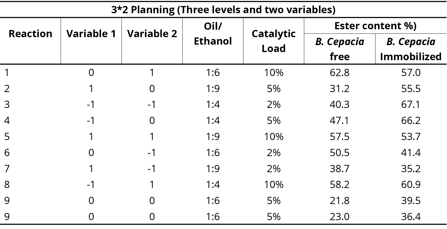 According to table 4, the results obtained from the experimental design show significant variations in the levels of esters obtained with values between 21.8 % and 67.1%. Reaction 3, in which the immobilised lipase was used, produced the largest amount of esters from the molar ratio of 1:4 (oil/ethanol) and a catalytic load of 2%.