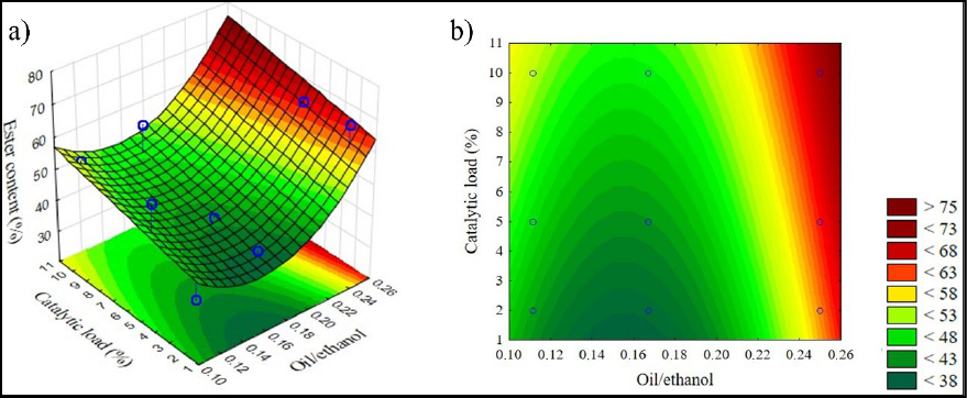 The catalyst load directly influences the content of esters produced; the literature has shown that a higher catalyst load generally allows higher yields, but only up to a limit, beyond which inhibition by an excess of catalyst or particle agglomeration can occur, decreasing its efficiency (Andrade et al., 2017a, 2017b; Arana-Peña et al., 2020; Baron et al., 2014b; K. S. Moreira et al., 2020; Pedro et al., 2017a).