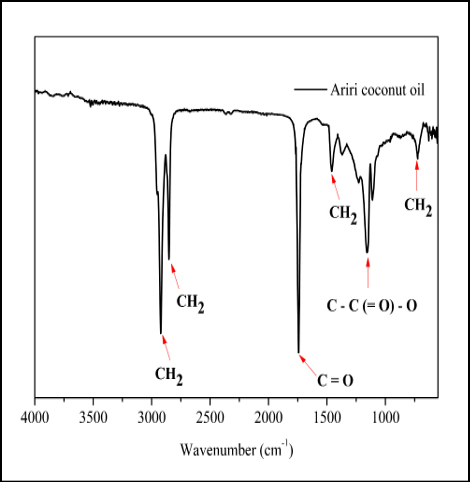 Analysing the spectrum, characteristics of the specific groups existing in ariri coconut oil can be observed. The methylene groups of the carbon chain of the esters are characterised by the absorption band related to the asymmetric stretching of CH2 in the regions of 2920 cm-1, followed by the absorption band at 2850 cm-1, referring to the symmetrical stretching of CH2, by the symmetrical strain band in the region 1462 cm-1 and angular deformations at 720 cm-1. Bands that relate to the characteristic functional groups of esters are located in the absorption band 1741 cm-1, referring to the stretching of the C=O group of the carboxyl group of esters and in 1161cm-1 referring to the deformation of the C – C(=O) – O group (Mukhametov et al., 2023; Shi et al., 2017; Silverstein et al., 2014).